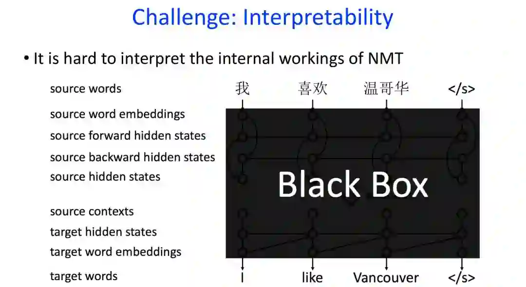 当输入一个句子和输出一个句子时,并不知道其生成过程;当出现错误时,也不知道是什么原因导致的。