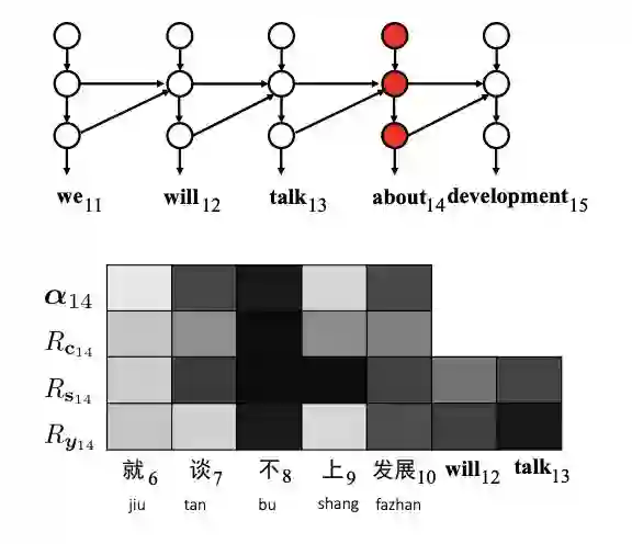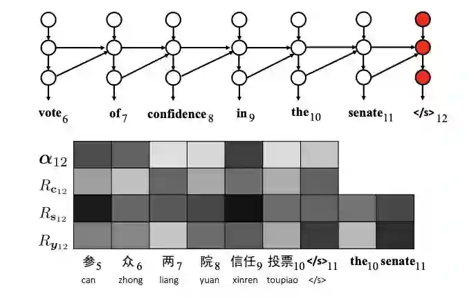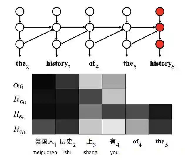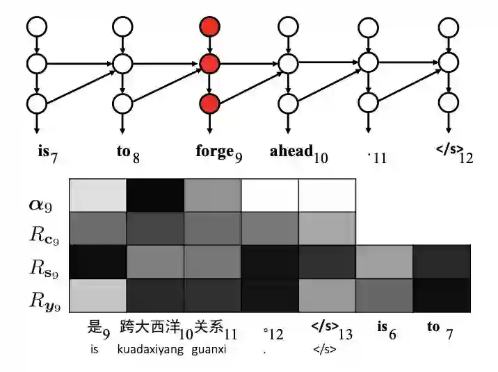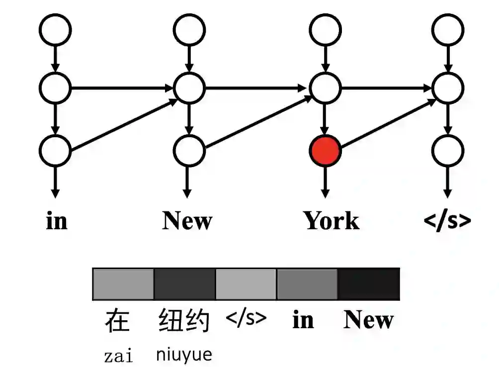 如下图所示,第三个目标词“York”的生成取决于源上下文(即源句“zai niuyue </ s>”)和目标上下文(即部分翻译“in New”)。