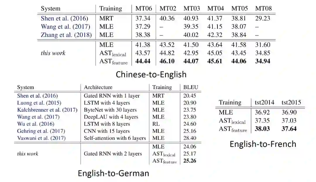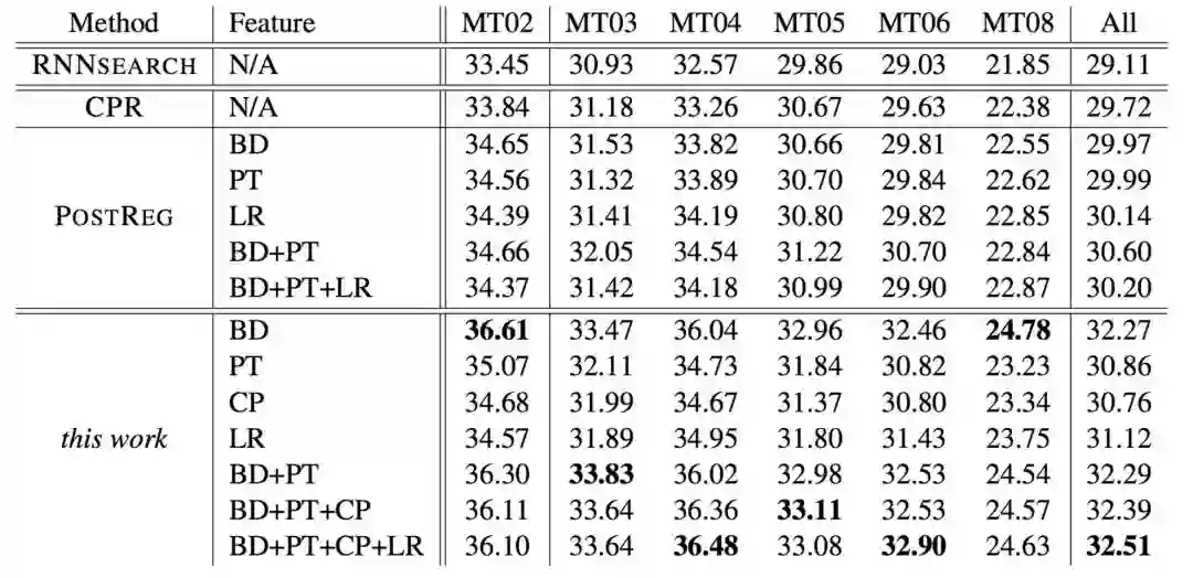 这项工作与RNNsearch、CPR和PostReg做了比较,性能对比结果如下: