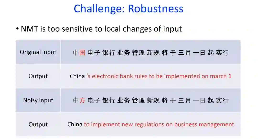 第三是鲁棒性。如何使NMT对噪声具有鲁棒性?