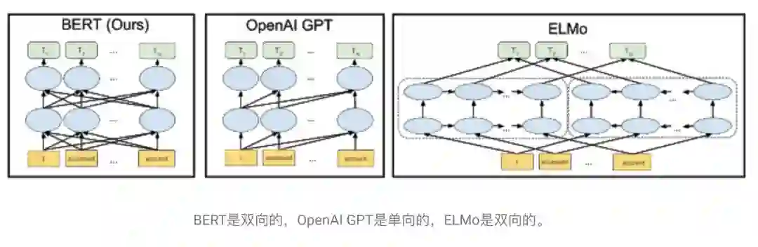 与先前工作中领先的上下文预训练方法相比,BERT 神经网络架构的示意图如下所示。箭头表示从一个层到下一个层的信息流。图示中顶部的绿色框对应每个输入词最终的上下文表示: