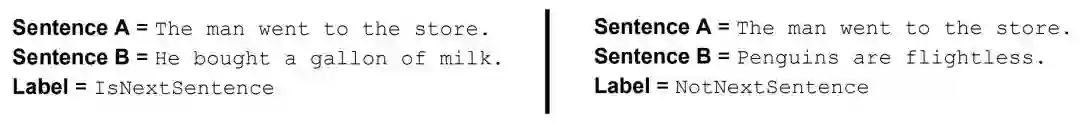 BERT 还学习如何建模句子之间的 关系,通过预训练对任何文本语料库都可生成的一个很简单的任务来实现:给定两个句子 A 和 B,判断 B 是在语料库中 A 之后实际出现的下一个句子,或者只是一个随意的句子?例如: