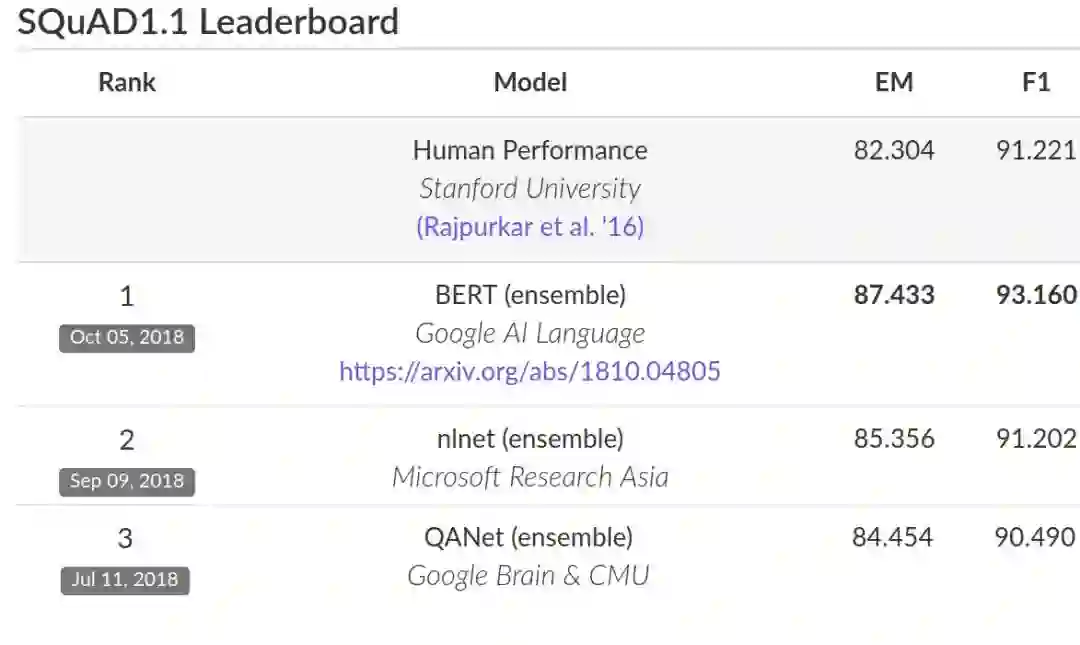 为了评估性能,我们将 BERT 与其他最先进的 NLP 系统进行了比较。需要注意的是,在我们的实验中,我们几乎没有针对特定任务而对神经网络架构进行更改。在 SQuAD v1.1 上,BERT 获得了 93.2% 的 F1 分数(一种准确度的衡量指标),超过了之前最高水准的分数 91.6% 和人类分数 91.2%: