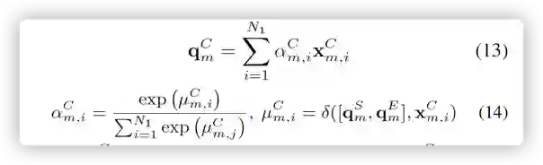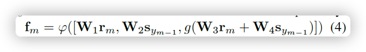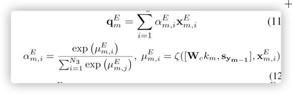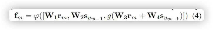 如果只基于图像特征选出图像中主要的内容,不同图像之间很难具有连贯性。所以在该模块中,通过将每个图像内容与之前生成的句子进行融合共同推断当前图像的主要内容。如下所示:
