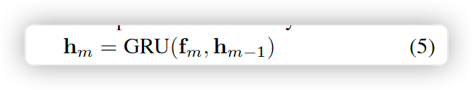 我们使用 GRU 通过为图像流中的每个图像生成一个想象的概念来生成一个 story line。以多模态融合向量 fm 作为输入,GRU 在时间步 m 的隐藏状态计算如下: