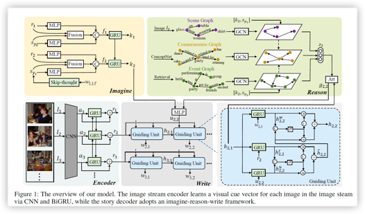 •Multimodal Imagining Module:生成一个富有想象力的故事情节•Relational reasoning module:充分利用外部常识 KG 和任务特定知识(场景图和事件图),并学习讲故事的互补语义特征•Story generation module:设计了具有引导单元的故事生成模块。
