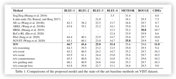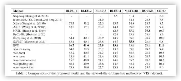 我们观察到 IRW 模型在大多数自动评估措施上的性能明显优于最先进的方法。具体来说,我们的 IRW 模型在 BLEU-4 和 CIDEr 上相对于现有最佳分数分别提高了 4.8% 和 3.7%。此外,我们的模型也大大优于 AREL、HRSL 和 ReCo-RL 方法,这些方法都采用强化学习范式来优化模型。通过部署强化学习可以进一步提高 IRW 的性能。