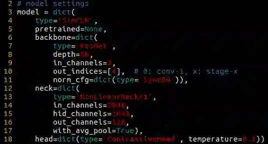 1. 改进现有算法。OpenSelfSup 用 config 文件来定义各种参数和模块,方便修改。config 中还支持一些较复杂的调整,比如 data augmentation 的组合、learning rate schedule、独立调整某些网络参数的优化参数等。例如,你希望单独调整 head 中 fully-connected layer 的 momentum 和 learning rate,或者 backbone 中某几层的 weight decay 等等,那么你可以在 config 中 optimizer: paramwise_option 下用正则表达式筛选出对应网络参数,然后指定这些值,而不需要改动代码。