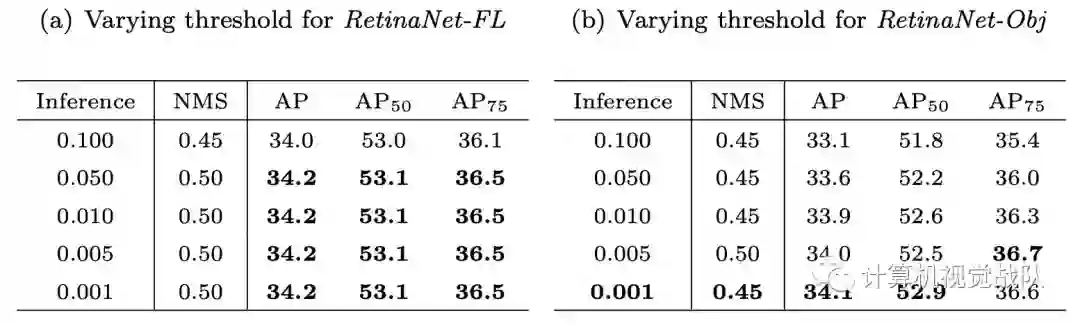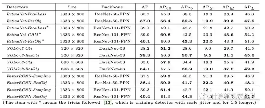 从最终结果来看,该方法迁移到不同方法上均有性能提升,在RetinaNet中有1个点的提升,和GHM相当;在YOLOV3和Faster RCNN中也有1个点的提升。如下: