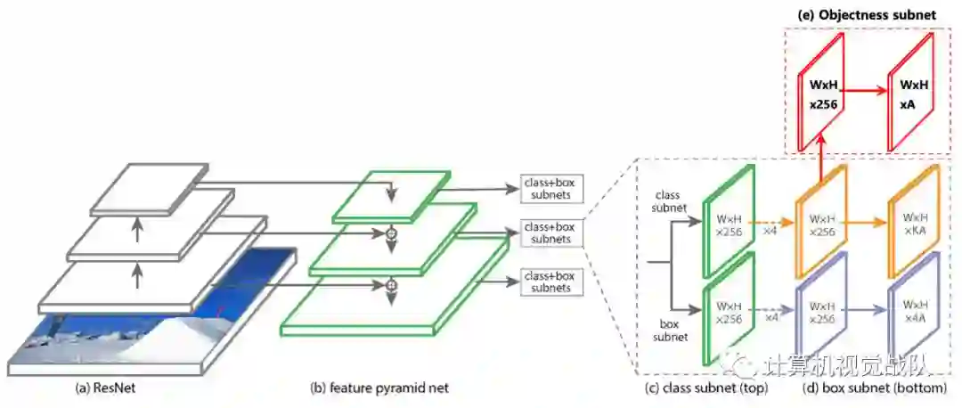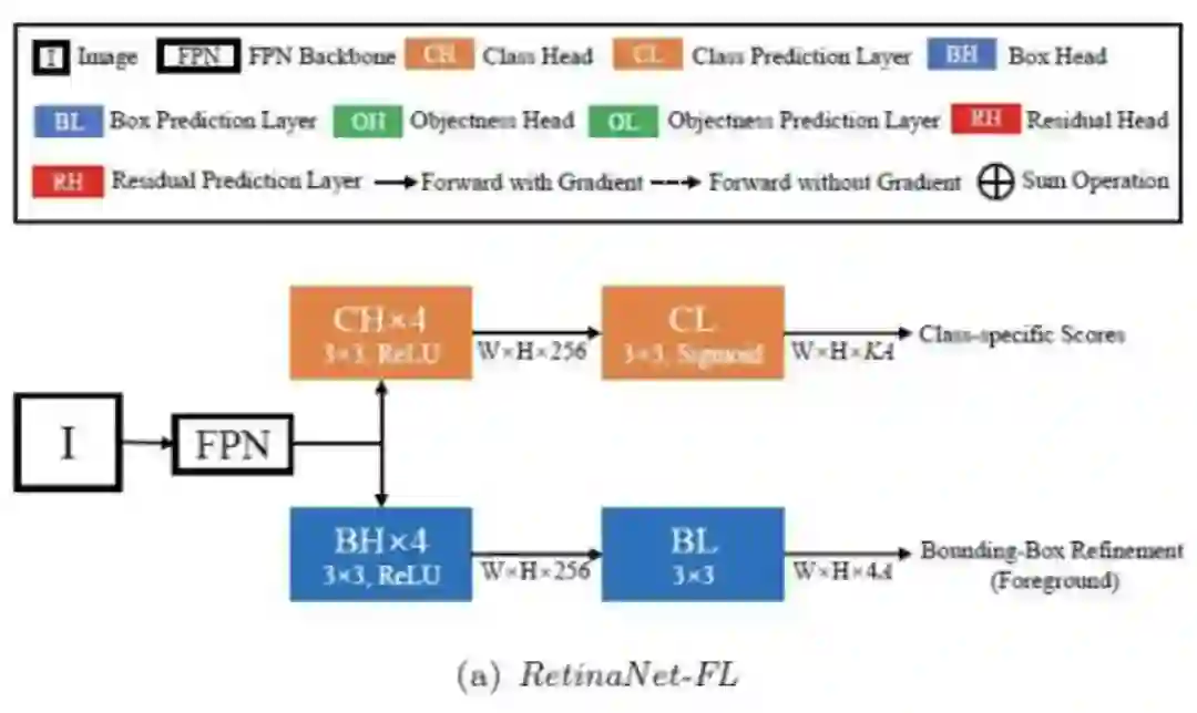 作者首先引入了另一种不同于Focal Loss处理样本不平衡问题的方法,即借鉴YOLO的方法,在head部分同时引入Objectness subnet的分支,在推理的时候采用如下公式: