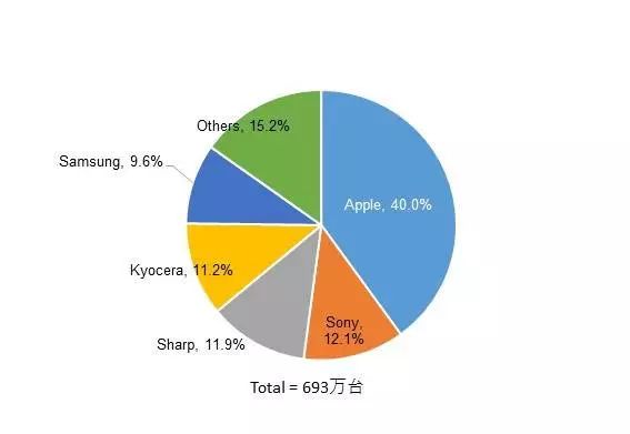 日本互联网数据中心发布的《2017 年第三季度日本手机和智能手机市场数据》报告显示,2017 年第三季度,日本市场智能手机出货量为 693 万台,其中苹果排名榜首,占比 40%;索尼占比 12.1%;夏普占比 11.9%;京瓷占比 11.2%;三星占比 9.6%。5 个品牌合计占比 85%。