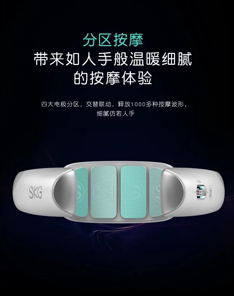 前不久上市的SKG全新K5按摩仪,不仅搭载了秘经通双脉冲技术,还根据人体工程学设计了四个分区,除了能更好的贴合脖颈,四个分区还能够有更多节奏地释放脉冲,产生更多样性、高度复合的按摩体感,避免单调重复的按摩节奏。