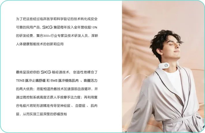 以头部品牌SKG为例,每年投入在研发上的预算就会占到全年营收超10%的比例。也因此率先创新性地糅合了TENS和EMS两种脉冲,加上对人体受力肌电信号的研究,突破了传统物理揉捏捶打等表层按摩的限制,深入实现对人体神经层、血管层、肌肉层的深度按摩和放松。形成了SKG具有优势的秘经通双脉冲按摩技术。