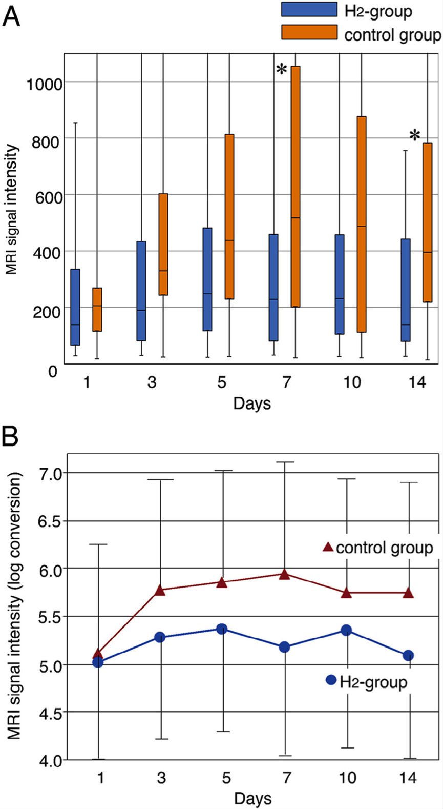所有患者脑梗死区域没有发现脑出血的磁共振信号,用相对信号强度表示梗塞区域的严重性,入院第1天个体相差比较大,两组没有统计学差异,其中氢气治疗组从28到855,平均为241;对照组则从18到1896,平均272 (Fig 4,A)。治疗第7和14天,情况发生了变化,氢气治疗组明显好于对照组(P=.025和.028)。对数据进行对数转换后发现两组差别更明显(P=.002)(Fig 4,B)。相对信号强度在治疗第10天降低为152%,第10天降低到121%,对照组一直保持在219%以上的很高水平。结果显示,氢气治疗对脑梗塞患者的脑组织损伤恢复有帮助。