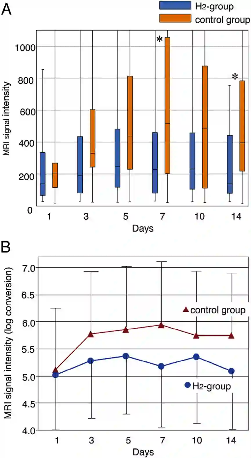 核磁共振成像结果表明,氢气治疗组比对照组脑梗死区域组织病理损伤更轻,恢复速度更迅速。治疗14天,相对损伤指数恢复到接近正常水平,治疗第10天仍然有轻微损伤,损伤往往是血脑屏障破坏后炎症性血管源性脑水肿。对照组无论是损伤高峰还是恢复过程组织损伤程度都显著超过氢气治疗组。结果提示,脑缺血后第5天氢气治疗组就开始恢复。核磁共振结果说明氢气不仅对脑缺血组织半暗带有作用,对缺血核心组织也有作用。说明如果能更早开始使用氢气治疗效果会更理想(本研究是6小时后开始治疗)。