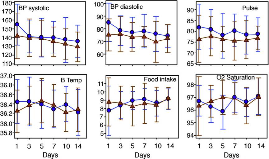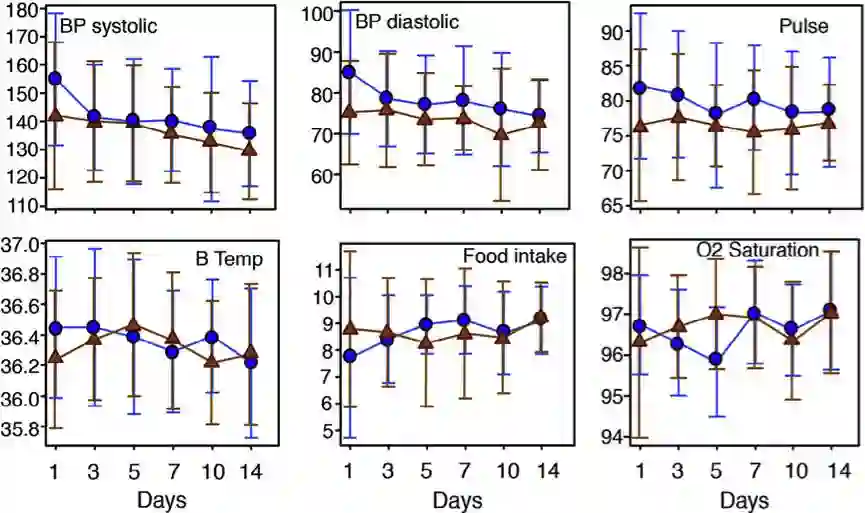 生命指标每天检测,连续14天,两组之间除氧饱和度(P = .03) (Fig 2)在氢气治疗组比对照组高以外,其他指标都没有发现明显差异。住院第1、7和14天血液生化检测也没有发现差异。这些结果提示,氢气治疗对急性脑梗塞患者是安全的。