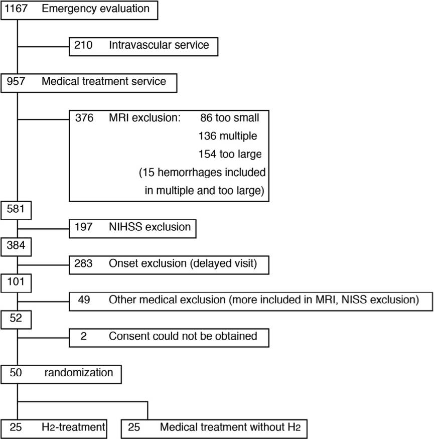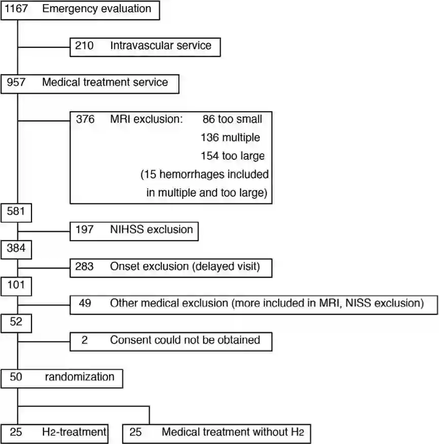 本研究招募了50名急性脑梗死患者,25名进行氢气治疗,另外25名为对照组。用这些患者的身份证号码用于随机分组。这个研究没有采用完全盲法,主要是因为一台安慰剂吸氢机没有到位。但是数据收集和分析都是采用盲法。护理人员和其他相关人员如参与研究的放射科医生和物理治疗师也都不了解细节。