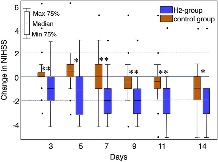 作为生物抗氧化剂,氢气分子对许多疾病具有治疗作用。许多动物实验研究发现,吸入浓度为1-4%的氢气对脑缺血。但是氢气临床应用需要有对患者的随机对照试验,2017年7月来自顺天堂大学藤小野Hirohisa Ono 教授在开放杂志The Journal of Stroke & Cerebrovascular Diseases上发表最新临床研究结果,首次证明人类脑缺血患者吸入氢气是安全的,多项临床指标显示氢气对脑缺血具有治疗作用。