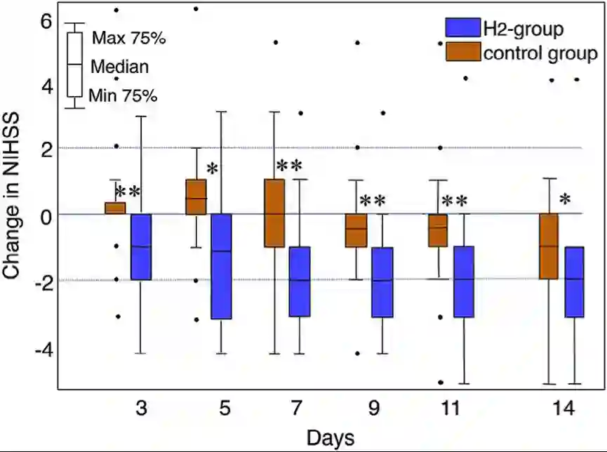 作为氢气治疗效果的评价指标,NIH中风评分也比对照组出现更明显好转。尤其是在治疗后3天,氢气治疗组已经显著好于对照组。患者日常生活活动能力是利用物理治疗数据进行评估,结果发现氢气治疗组多种指标好于对照组。
