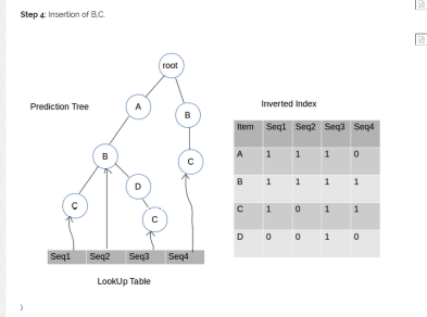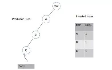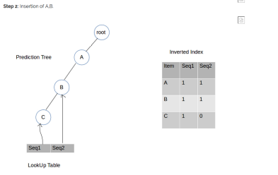 查看下一项,即B,看看B是否作为当前节点A的子节点存在。如果不存在,我们将B添加到A的子列表中,在带有seq1值的倒排索引中添加B的条目,然后将当前节点移动到B。