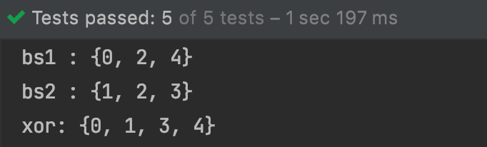 BitSet bs1 = new BitSet();bs1.set(0);bs1.set(2);bs1.set(4);System.out.println("bs1 : " + bs1);BitSet bs2 = new BitSet();bs2.set(1);bs2.set(2);bs2.set(3);System.out.println("bs2 : " + bs2);bs2.xor(bs1);System.out.println("xor: " + bs2);
