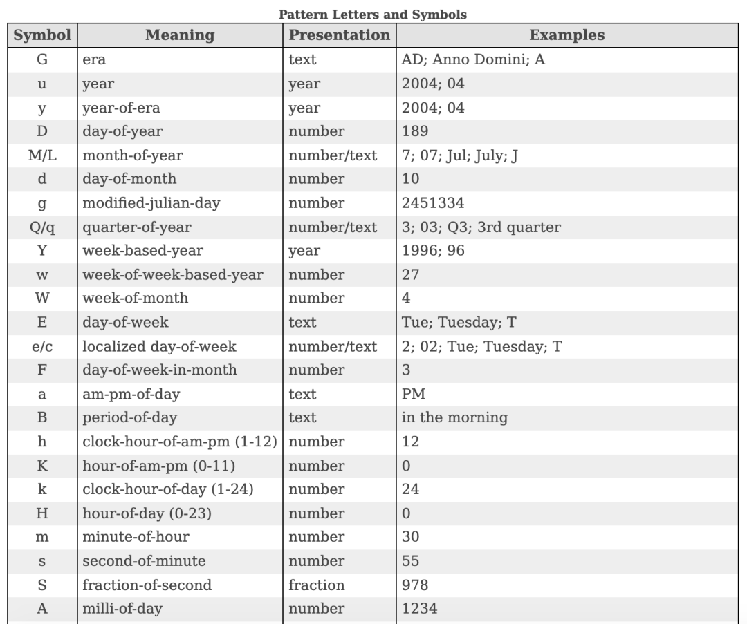 好,稍等……现在,你可能会问这个格式为什么叫做 B。事实上,对于这种类型的格式来讲,它不是最直观的名字。但也许下面的表格能够解决我们所有的疑惑。它是 DateTimeFormatter 能够处理的模式字符和符号的片段。我猜想,B 是第一个空闲出来的字母。当然,我可能是错的。