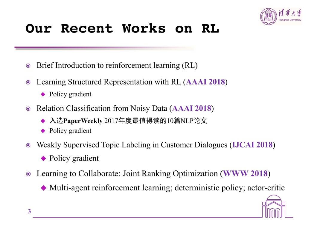 这些工作具有的共性是:在无直接监督信息、弱信号场景中,利用强化学习的试错和概率探索能力,通过编码先验或领域知识,达到学习目标。演讲者也将分享强化学习应用中的一些经验和教训。