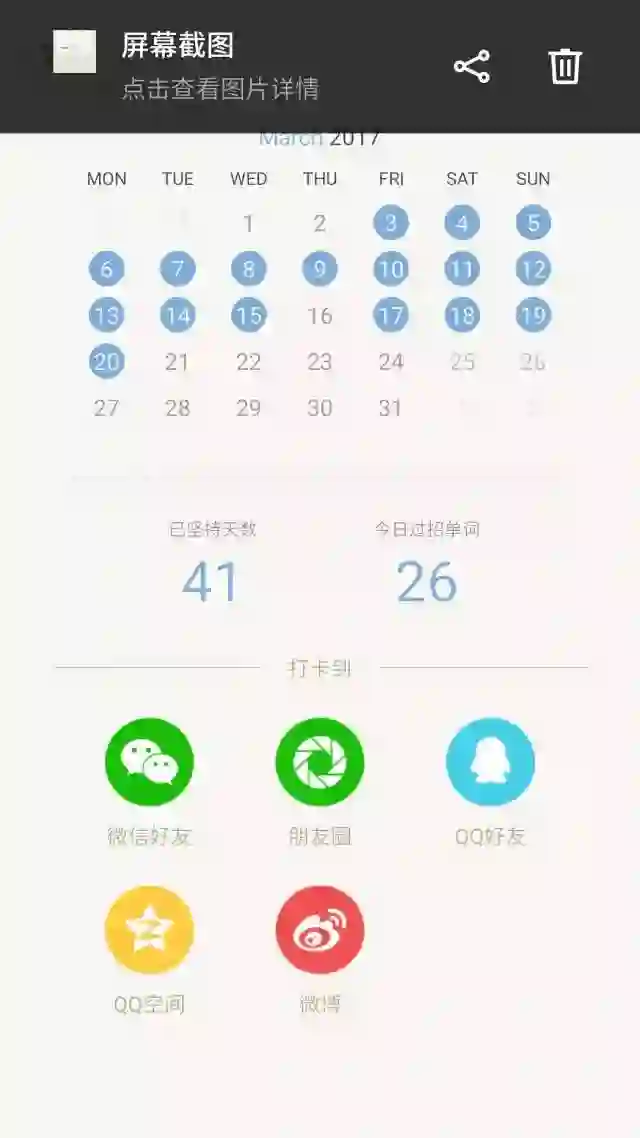 我每天只记15个但坚持,基本没有漏掉过,但有时候软件在没有网络的情况下会打卡失效。