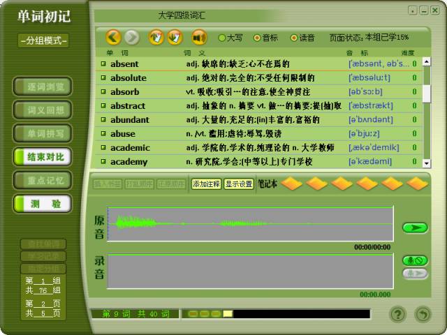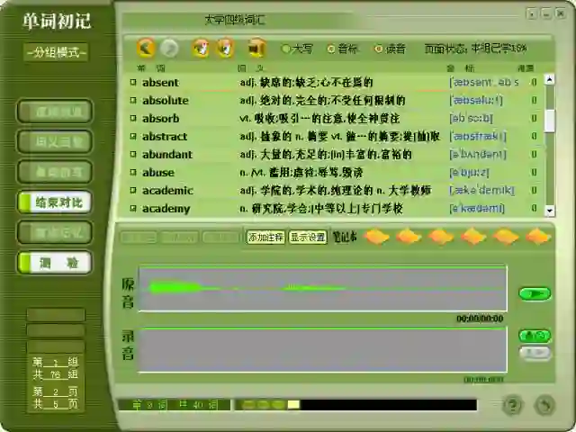 功能:单词初记、单词复习、测验与游戏、书籍管理、笔记本管理