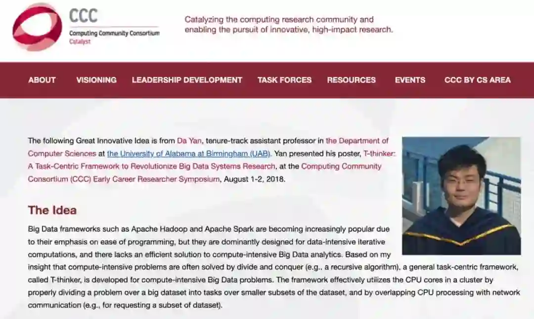 如果现在还没说服你继续读下去,而你恰好是搞大数据系统和算法研究的学者(业界见文本最后哈,不要走开!),那让我们看看 T-thinker 的研究可以在顶级计算机会议和期刊上有多高产!值得注意的是,T-thinker 是一个非常新的 topic:初步的概念发表在笔者等在 PPoPP’19 上的海报(poster)论文《T-thinker: A Task-Centric Distributed Framework For Compute-Intensive Divide-and-Conquer Algorithms》上,并且被计算研究协会(CRA)的计算社区联盟(CCC)评为伟大的新创意之一(https://cra.org/ccc/great-innovative-ideas/t-thinker-a-task-centric-framework-to-revolutionize-big-data-systems-research/,见图 2)。可以看 YouTube 的小伙伴们的可以戳这里看 T-thinker 相关的介绍性短视频: https://www.youtube.com/watch?v=3ub2ACLlg6M (见图 3)。