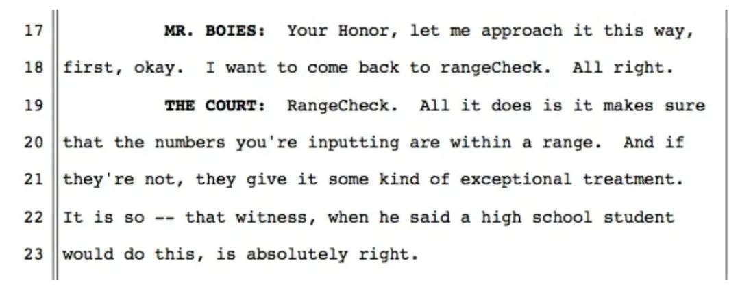 「在接手这个案子之前,我对 Java 一无所知,」这位法官说。「但是现在我已经写了很多代码,也已用很多其他语言编过程序,现在也还在编程。我写过一百多段 rangeCheck 这样的代码。我都能做到,你也能,这太容易了。」