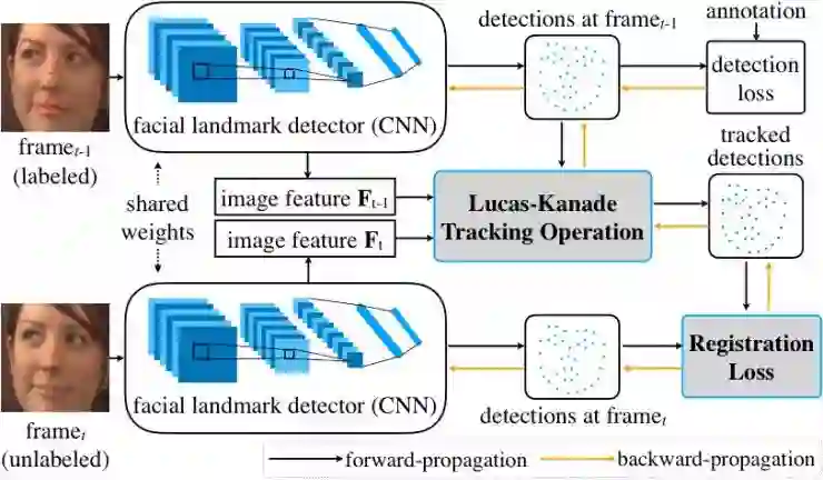 SBR 的训练过程包含两个损失函数。一个是检测器损失函数,另一个是时序配准损失函数。这两者可以相互补充让人脸关键点检测器更加鲁棒。检测器损失函数作用于模型检测结果和人工标注上,优化使得在有标注的数据上,模型的检测结果和人工标注尽可能的接近。时序配准损失函数是优化在连续几帧内关键点检测结果的时序一致性。具体来说,输入连续的两帧图像 t-1 和 t,通过同一个人脸关键点检测器后,可以得到对于第 t-1 帧的检测结果和第 t 帧的检测结果,我们将第 t-1 帧的检测结果通过 Lucas-Kanade 算法跟踪到第 t 帧得到结果,时序配准损失函数就是为了让在第 t 帧上跟踪得到的结果和检测得到的,尽可能一致。值得注意的是,因为 Lucas-Kanade 算法不需要训练且有封闭解,我们将 Lucas-Kanade 算法写成了一个可求导的模块嵌入到 CNN 中。在训练的时候,检测器损失函数利用人脸外观信息通过人工标注学习关键点检测器;时序配准损失函数通过嵌入 Lucas-Kanade 模块保证了时序一致性。梯度可以通过 Lucas-Kanade 模块传给检测模型使得检测结果在相邻帧上一致。