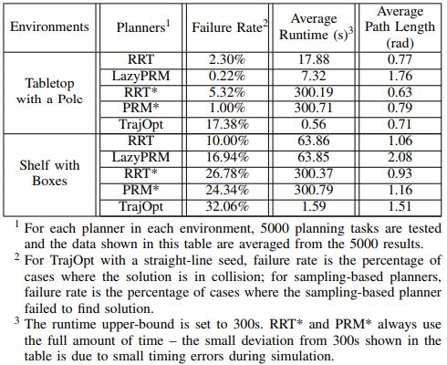本文对几个有代表性的基于采样和基于优化的运动规划器进行了评估,然后我们引入了一个集成的运动规划系统,该系统将轨迹优化的最新进展纳入稀疏路线图框架。通过在4个常见的拥有5000个测试案例的应用场景中的实验,我们发现单独的基于优化或基于采样的规划器无法解决需要快速规划的实际问题。据我们所知,这是第一项在大量实验的基础上对最先进的运动规划器进行系统和全面的评估工作。