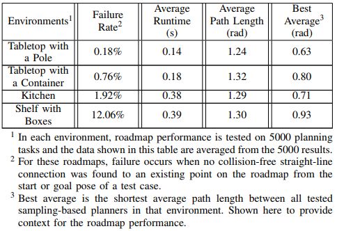 然后,我们将不同的独立规划器与轨迹优化相结合。结果表明,稀疏路线图和轨迹优化的结合有着较其他基于标准采样的规划器组合更优越的性能。我们的方法使用了多查询路线图而不是为每个规划问题生成全新的轨迹,并且我们的方法允许扩展,例如与跨规划问题的轨迹相关联的持久控制策略信息。此外,由路线图的稀疏性产生的次优性以及来自环境的意外干扰都可以通过实时轨迹优化过程来克服。