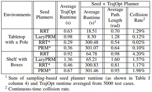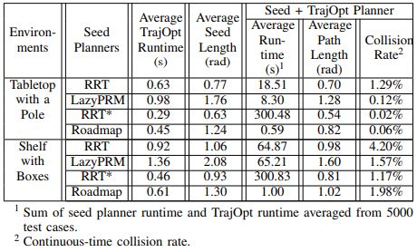 表2 “SAMPLING-BASED SEED +TRAJOPT”规划方法组合的性能评估。