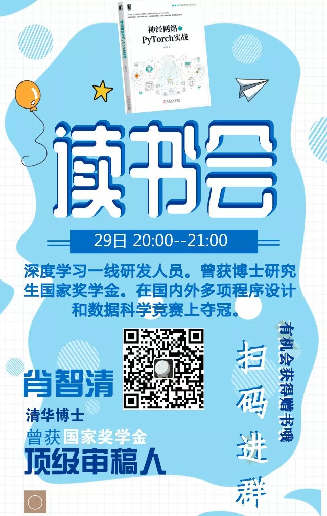 扫描下方海报二维码,添加小助手,回复「分享」,小助手会邀你进群。免费听《神经网络与PyTorch实战》该书作者肖智清的分享。