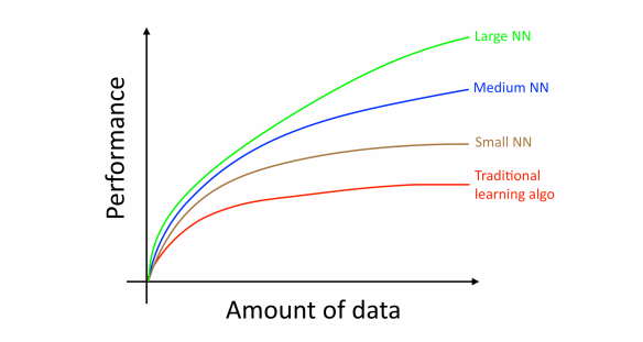 数据规模的扩展推动了深度学习的发展。如下图 Andrew Ng 在《Machine Learning Yearning》一书中展示的图。当达到一定的数量后,传统算法的性能不再随着数量而获得提升;但是,大中型神经网络计算的性能依然会持续提升,并且与传统算法的性能优势差距越来越大。