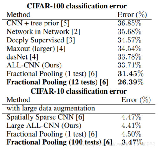 可以看到我们的效果依然很好,超越了前面的网络模型。仅仅被Fractional Pooling超过,但这个模型参数过大,大概50M左右的参数。所以我们的模型表现是十分不错的。