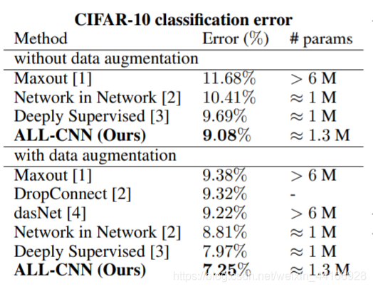 再B,C两组中, ALL-CNN都得到了最好的效果。而在A组,池化的效果比Strided的效果更好。「为了保证不是因为参数量增加而引起的,我们也对比了ALL-CNN-A」。事实证明池化操作是能提高网络性能的