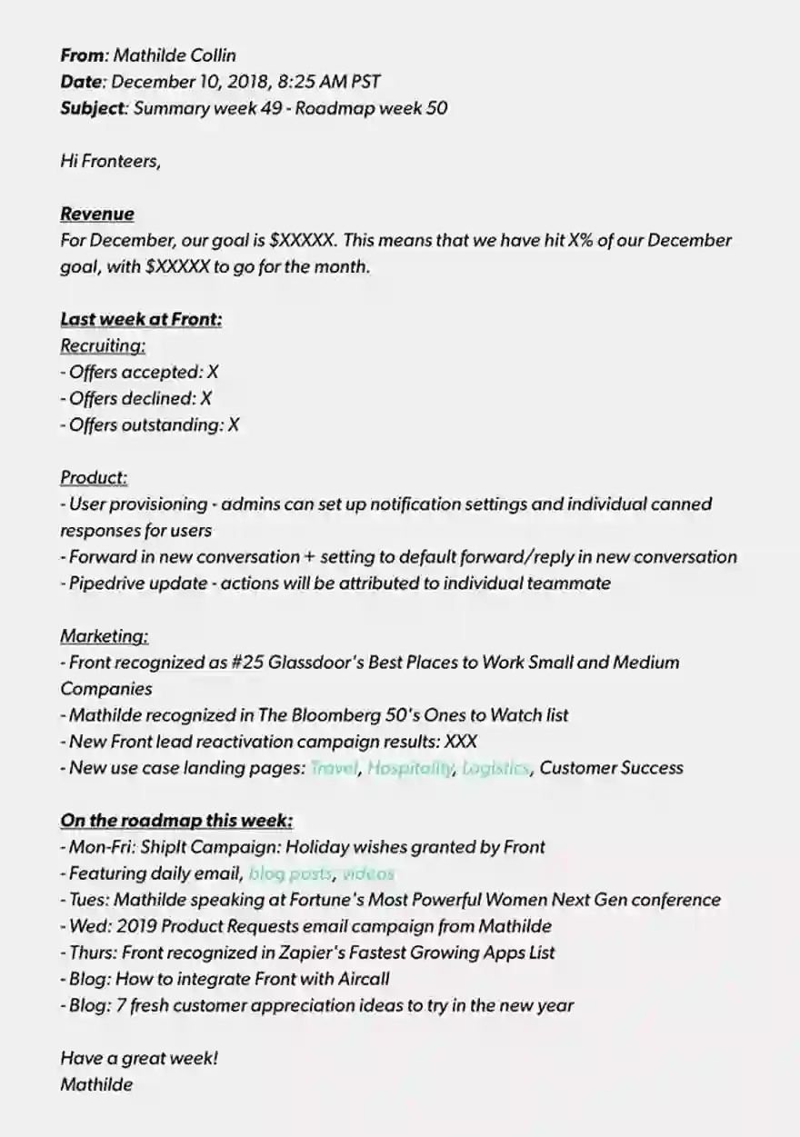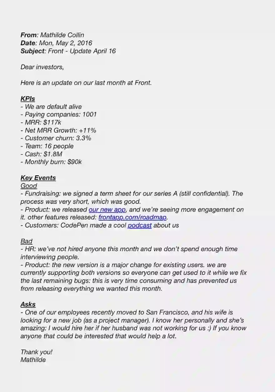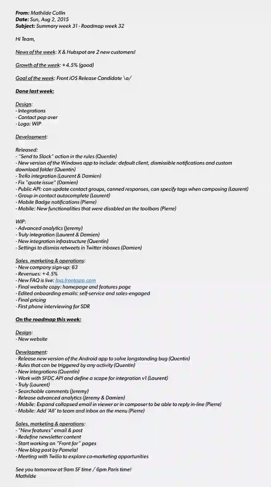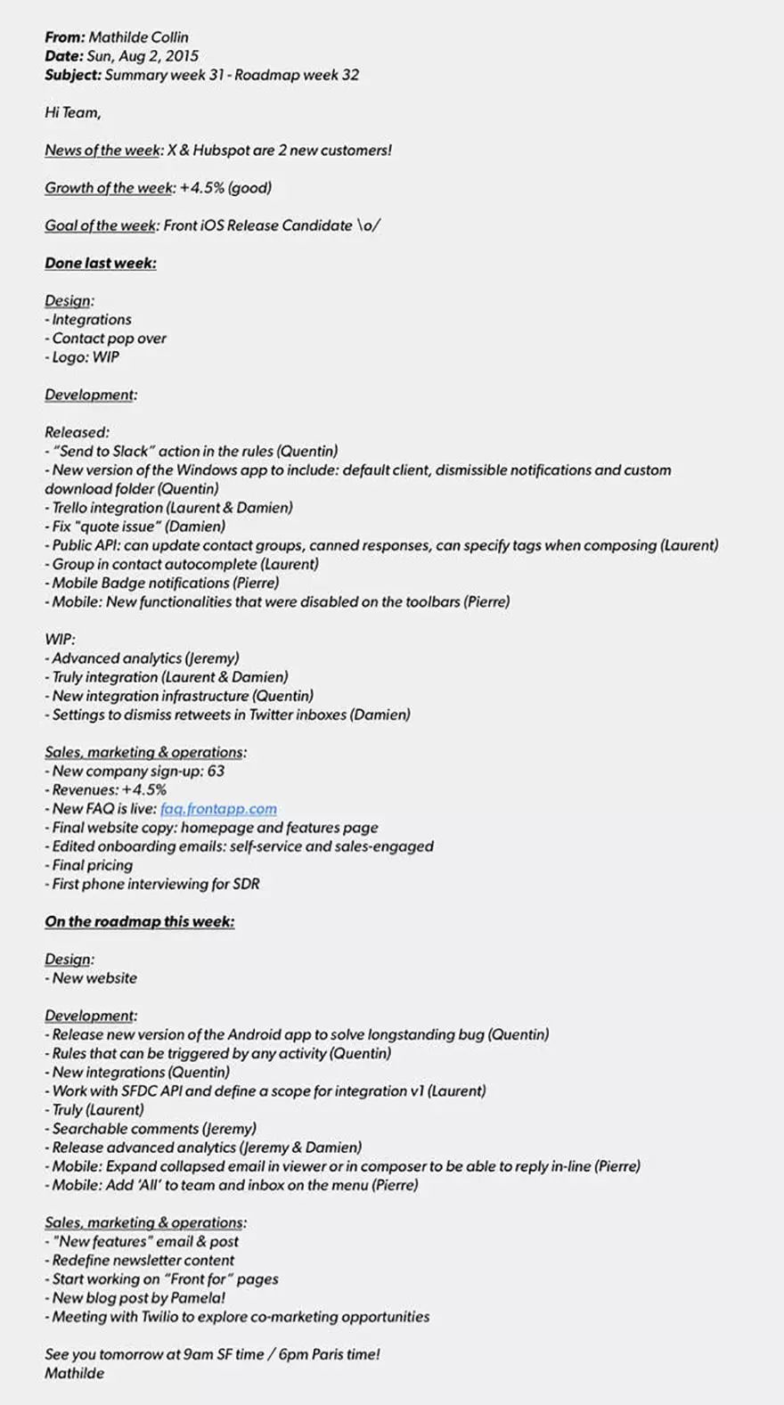 对Collin来说,这种纪律体现在她精心发送的三封邮件,从企业创立到现在从未间断,令人震惊,这三封邮件包括每周更新公司情况,直接报告,每月向投资者汇报情况。下文将告诉你这些邮件的具体内容及其对Front产生的深远影响。