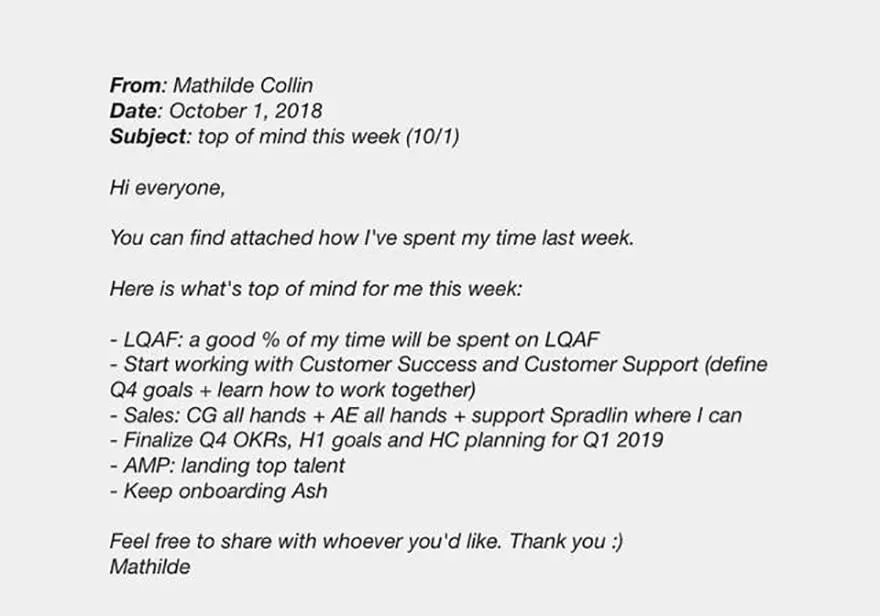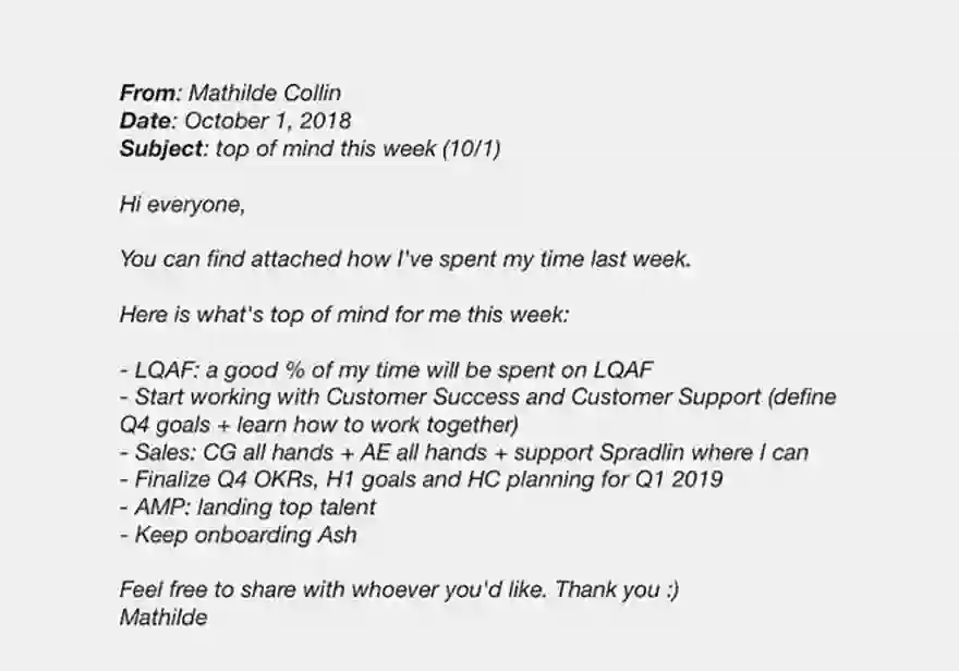 Collin解释道:“我很快可以完成一周目标,但这不是要告诉员工的事情,员工需要通过你的日程知道什么是重要的事。让员工了解上级的工作是有必要的,因此我会让他们知道他们的首席执行官在做什么,通过邮件为大家树立起榜样。如果我自己退步或者没有完成目标,那就会带来不良影响。”