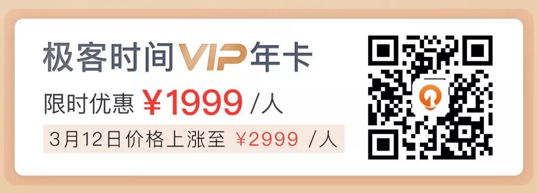 对的人永远能把握住对的时机,相信你也不例外。给大家推荐极客时间 VIP 年卡,365 天畅看极客时间全部课程,从个人技术能力到领导力等全技术领域知识。为接下来的职业发展、个人能力提升、或升职加薪做更从容的准备。