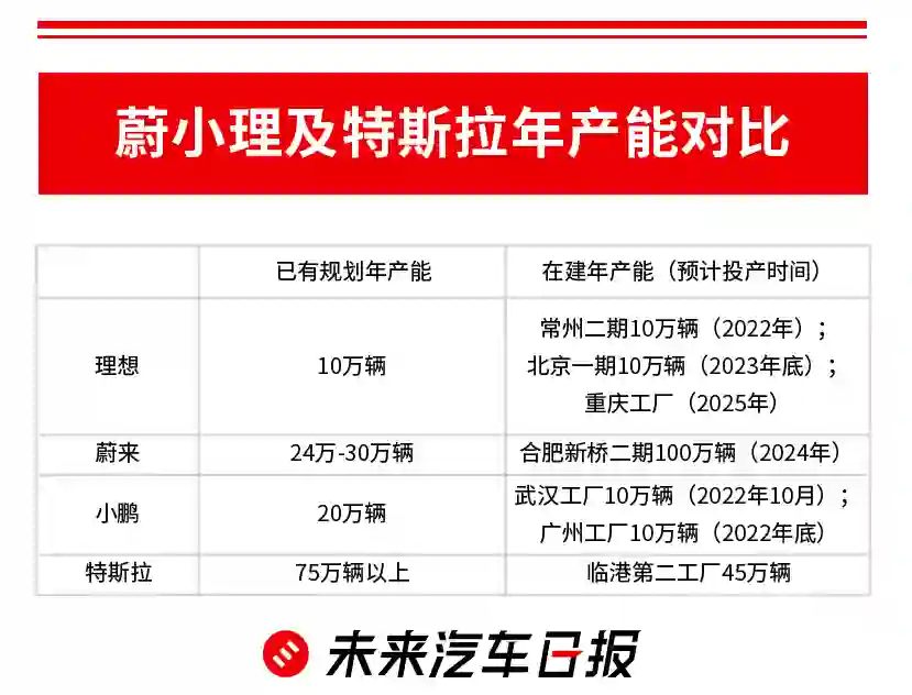 理想、蔚来、小鹏、特斯拉国内产能对比图