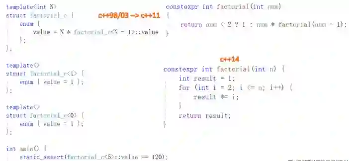 一个典型的例子就是constexpr特性,它是在C++11中被引入的,用作编译期计算。通过它,可以用很简单的方式实现编译期计算,不用再像以前一样需要通过模版元编程来实现,使用难度大大降低。