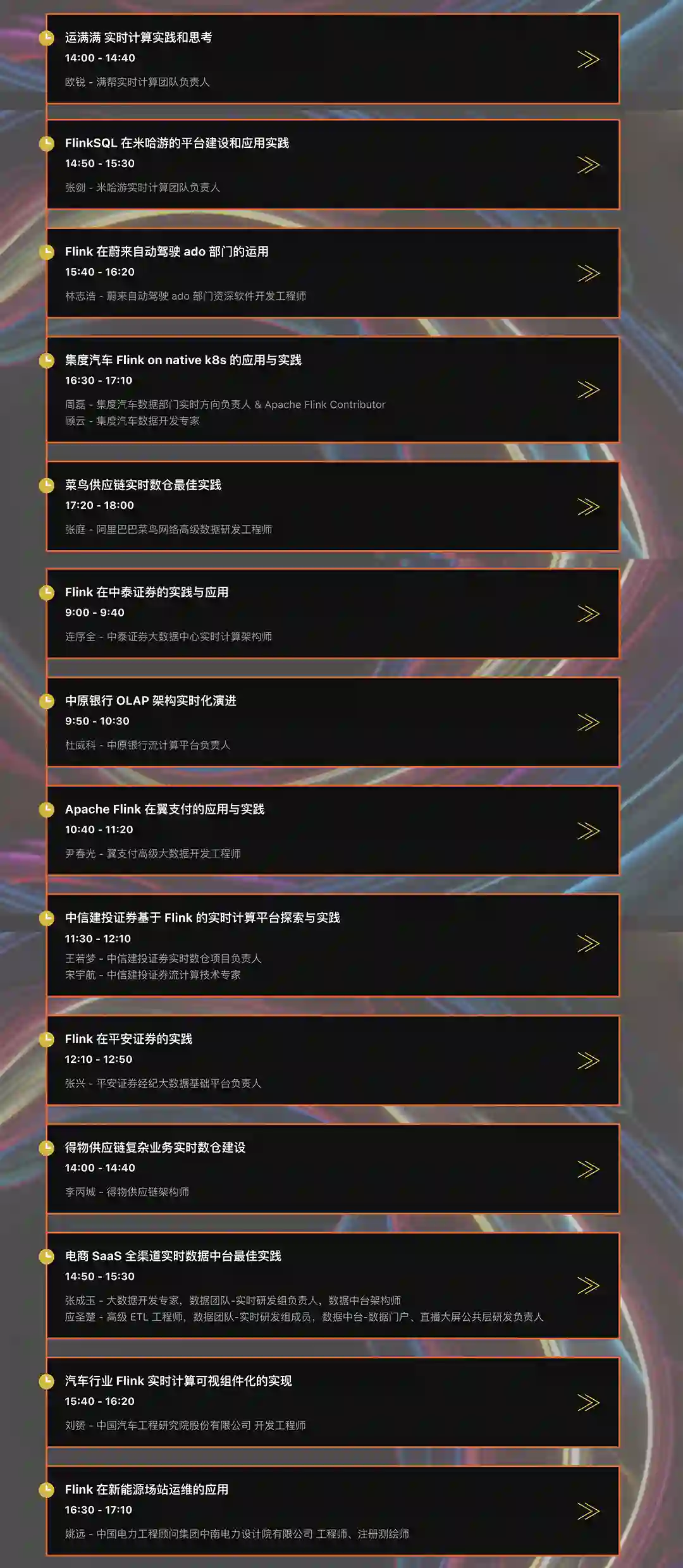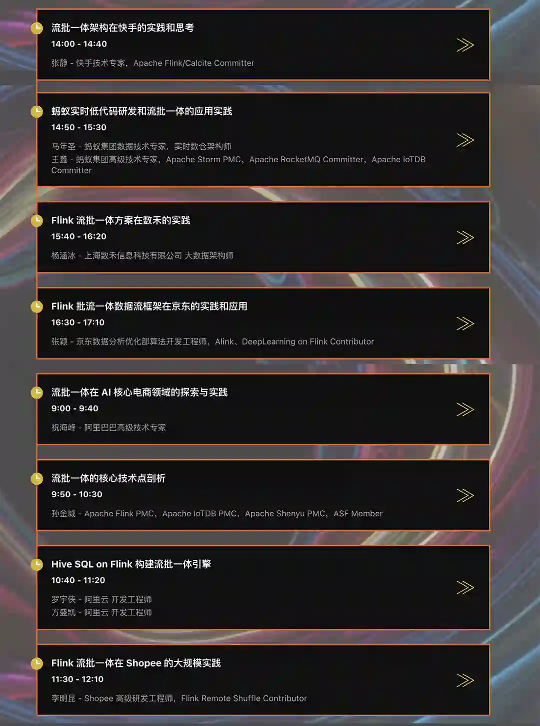 平台建设专场由来自爱奇艺、知乎、Dinky 社区、货拉拉、美团、联通、小米、StreamPark、阿里巴巴、蚂蚁集团的技术专家分享基于 Apache Flink 的实时计算平台演进与实践。