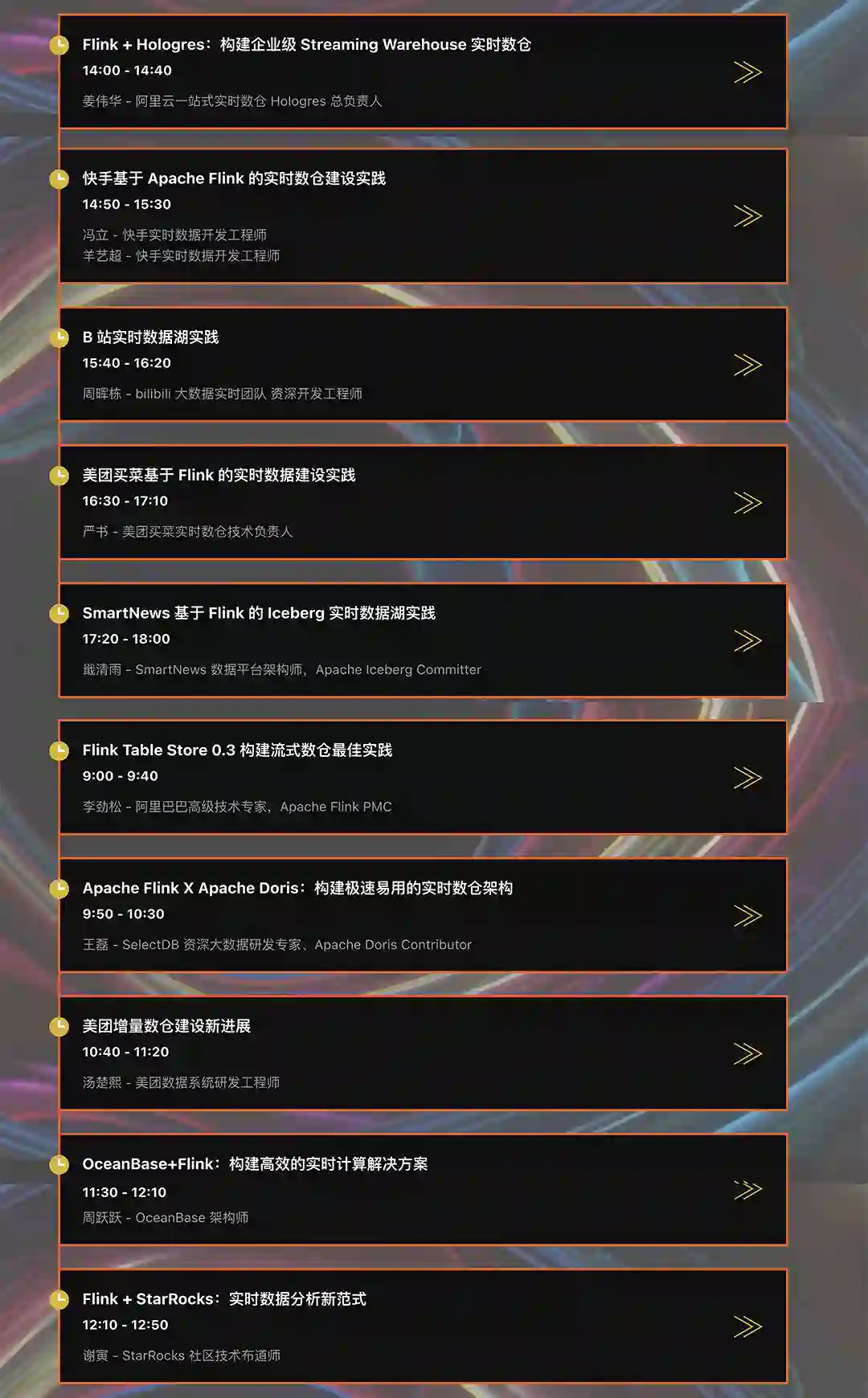 实时湖仓专场邀请快手、bilibili、SmartNews、美团、SelectDB、OceanBase、StarRocks 等企业技术专家分享基于 Flink 的实时湖仓建设实践与思考。