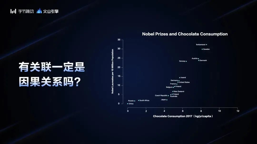 我们再举个有趣的例子,诺贝尔奖和巧克力消费量的关系图。图片显示,巧克力吃得越多的国家,诺贝尔奖得主就越多。如果想改进中国的科技水平,多拿诺贝尔奖,我们应该多吃巧克力吗?这显然不靠谱。可能会变胖,但很难拿到诺贝尔奖。