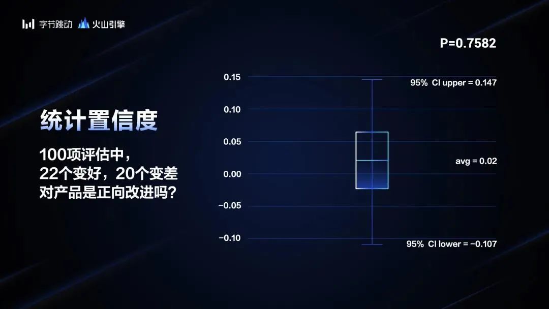 我这里写了一个置信度,P 值 = 0.75,这是什么意思?我们通常认为,P 值要小于 0.05,这个数据才是可信的,也就是 A 比 B 好。0.75 的意思是 “A 比 B 好” 碰巧出现的概率是 75%,这是不可信的。我们把这个箱型图画出来,它波动的范围如果按照 95% 的区间,从 - 0.1 一直到 0.147,是非常大的范围。把置信度画出来,发现这个实验完全不能说明 A 比 B 好。结论就是:这个实验不可信,没有显著性,完全不能从这个实验中得出 A 比 B 好的结论。