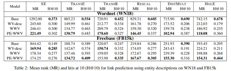 在本节中,我们评估了在Freebase[Bollacker等人,2008]和Wordnet[Miller,1995]的标准子集上提出的嵌入增强方法。我们将这些方法应用于表1中的每个评分函数,证明了它们增强现有嵌入模型的能力。我们首先将链路预测任务中的WWV和PE-WWV模型与包含实体描述的替代方法进行定量比较,然后定性地检查WWV模型,以更好地了解其性能。接下来,我们将FeatureSum模型与使用非结构化文本语料库的替代方法进行比较。