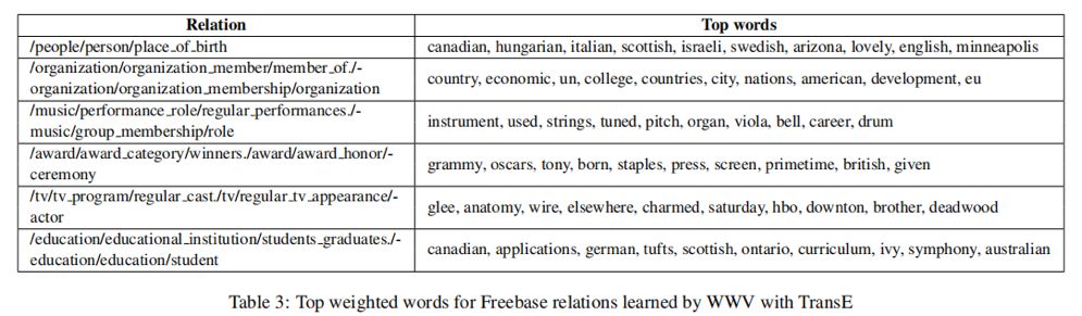 为了更好地理解WWV模型是如何工作的,我们在训练之后检查哪些单词被赋予了每个关系的最大权重。表3列出了使用TransE训练的Freebase中几个关系ri的前10个单词(从Bi中最强的权重中提取)。